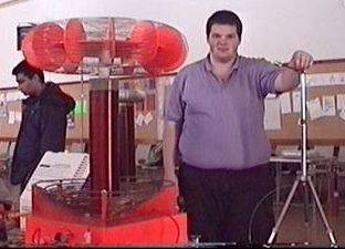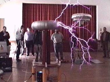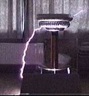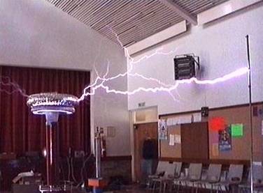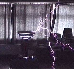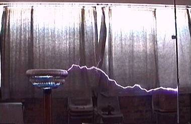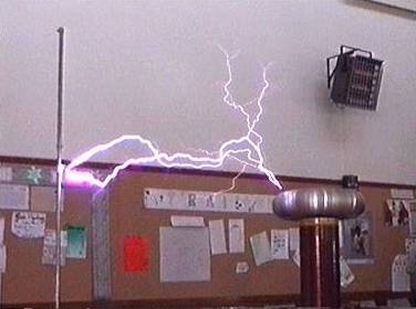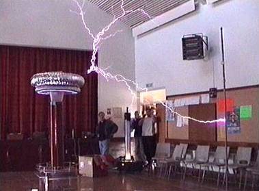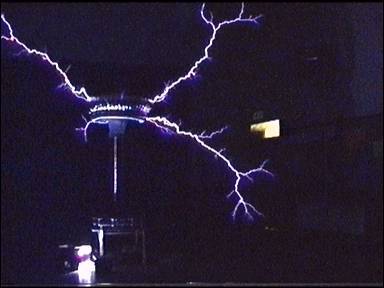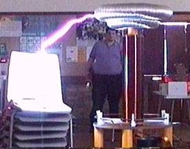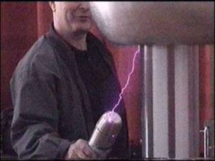 As the arc distance got greater his arm began to jump more at each discharge. Eventually the metal target became further from the discharge terminal than his head, and he got a surprise ! Do not try this with a Tesla Coil. |