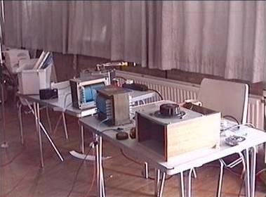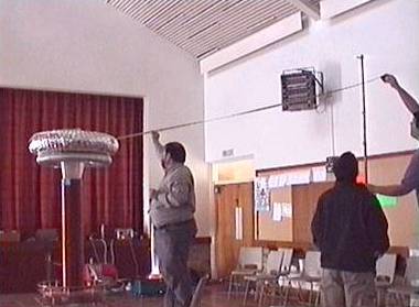 Later a third variac and ballast were added to make the 10 foot arc a possibility. Alan Sharp, Bob Golding and myself stood behind the table and manned the controls. All three variacs had to be kept reasonably synchronised so Alan called out "20… 40… 60… 80… 100" as he increased the variac setting. We didn’t hear anything past 40% because of the incredible noise ! Occasionally a streamer from the coil would finish quite close to the operators, so a grounded wire was arranged in front of the operators for safety. |