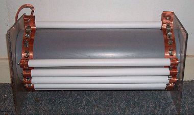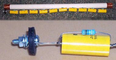 Each white plastic tube contained ten 47nF 1500V capacitors wired in series. There was space on the frame for up to 20 strings giving a maximum of 94nF tank capacitance. Click here for a close-up of the connections. |