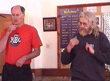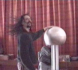 Mike stood on an insulating crate and placed one hand on Tim Davey's Van de Graaff generator. As the charge built up over several seconds his hair took on that Medusa appearance. After a round of applause he was then safely discharged. |
