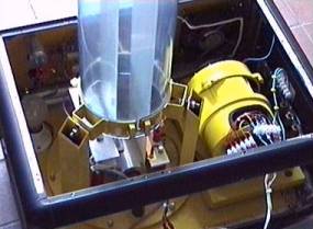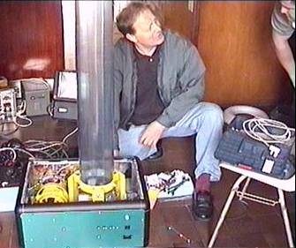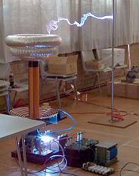 The TC is powered by an externally ballasted 9.6kv radar power supply, and uses a 200BPS synchronous rotary spark gap. It was planned to run this TC up to 2.4kW at the Teslathon, but the absence of nearby garage walls caused long arcs to curve inward and strike the primary. (Photograph provided by Bob Golding.) |
