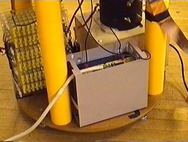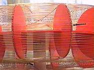 This coil uses an inclined primary winding which is mounted on a box containing the spark gap, primary capacitors and wiring. An additional metal enclosure contains ballasts, metering, and control electronics. The toroid of this coil uses an unusual construction technique. It consists of an internal frame which is covered with many copper wires spaced 5mm apart to form the surface of the toroid. |