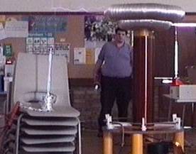 This coil was fitted with a 24" polished aluminium toroid, which was just on the verge of breakout. During this demonstration the coil would sporadically let-rip with very noisy discharges of 5ft or more. After breakout the streamers would slowly drift over the smooth surface of the toroid. Very exciting to watch. (From a safe distance ;-) This coil also triggered a car alarm outside the church hall when the breakout was suppressed ! |