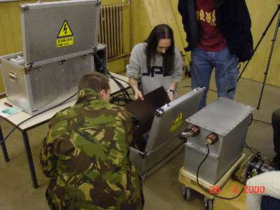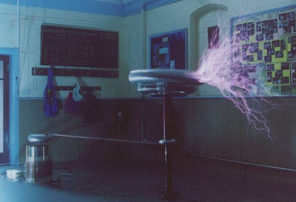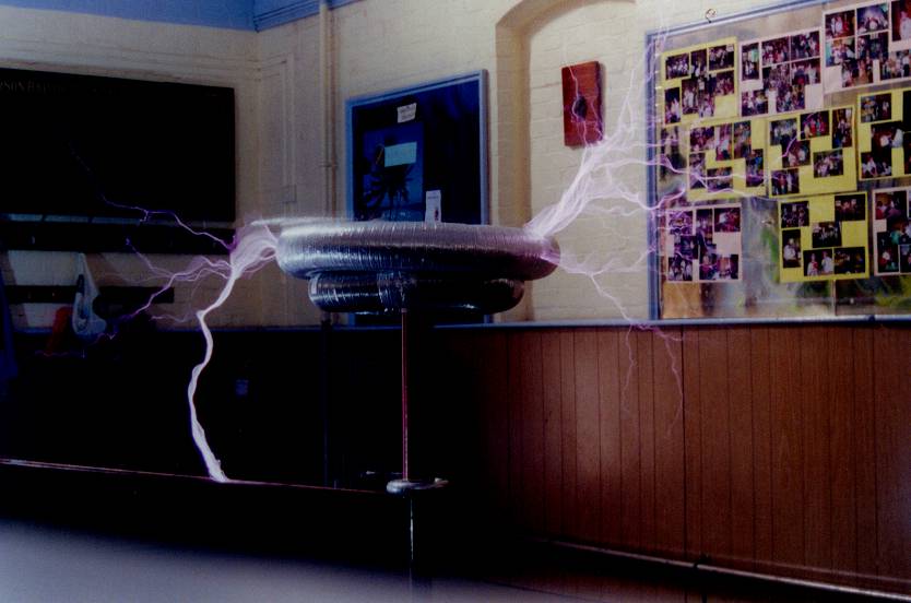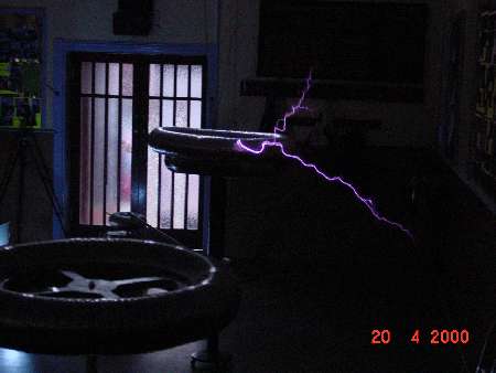___The First Reading Teslathon took place on 21st of April at Anderson Baptist Church, in Reading. This teslathon was concieved as an opportunity for the higher power coils to stretch their legs unimpeded by lack of space or large crowds. The evening was a thorough success, with Nick's coil cranking out some juicey 8 footers, from only 3kVA input and Mike & Brian sparking up their first magnifier.